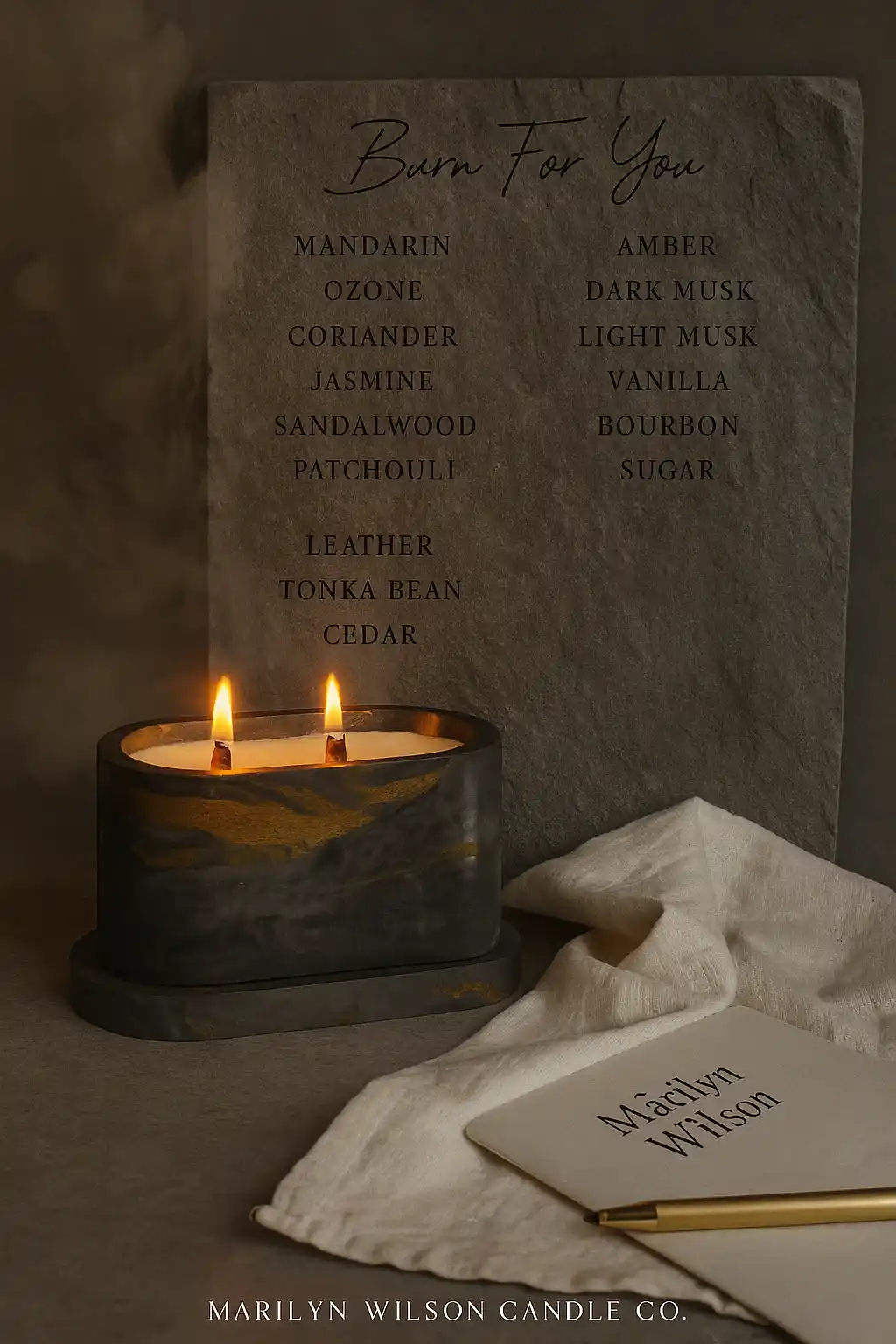 Ignite your senses with Burn for You, a candle that embodies passion and warmth. A blend of mandarin and ozone teases the air, while amber and patchouli create an irresistible embrace. Soft floral notes of jasmine add romance, leading to a velvety base of vanilla, bourbon, and sugar that lingers like a lover’s touch.