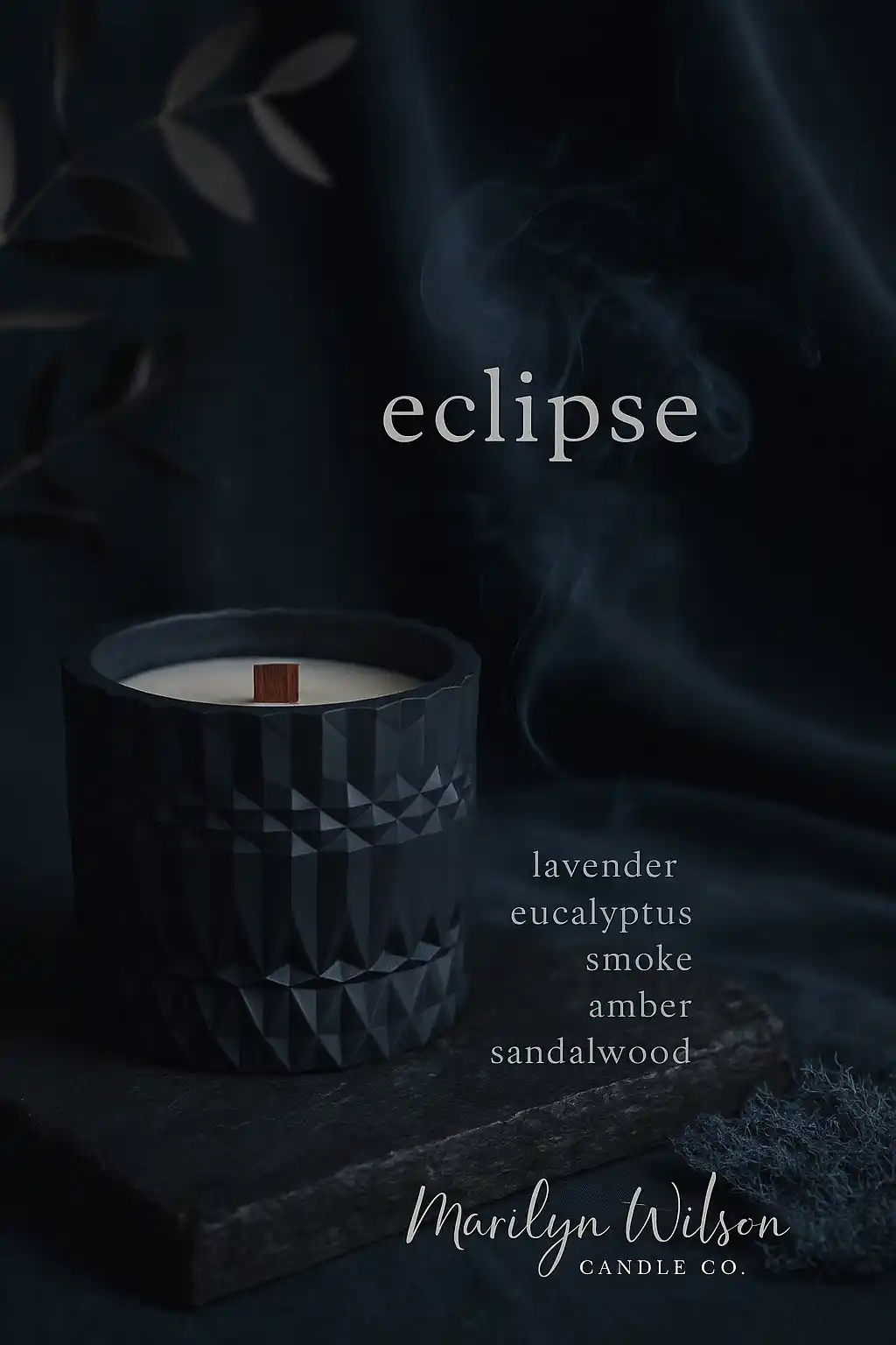Experience the magic of the season with Eclipse, a candle that exudes mystery and holiday warmth. The captivating fusion of smoky embers, dark musk, and aquatic amber conjures visions of crackling fires and snow-dusted evenings under a starry sky. Subtle lavender and sandalwood notes add a touch of serenity, while earthy vetiver and patchouli envelop you in a rich, comforting embrace.