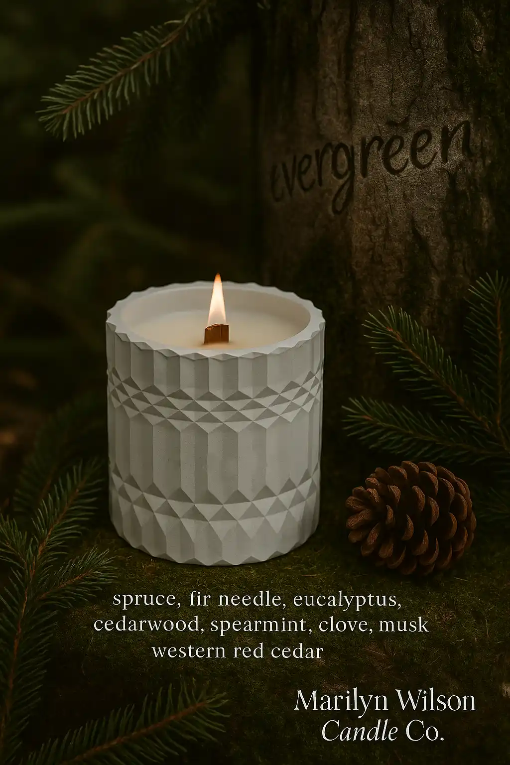 Notes of spruce and fir needle drift through the air, laced with cool eucalyptus and sweet spearmint. Cedarwood and clove warm the base, while musk and red cedar anchor the forest stillness. This is the scent of crisp walks, quiet snow, and evergreen grace.