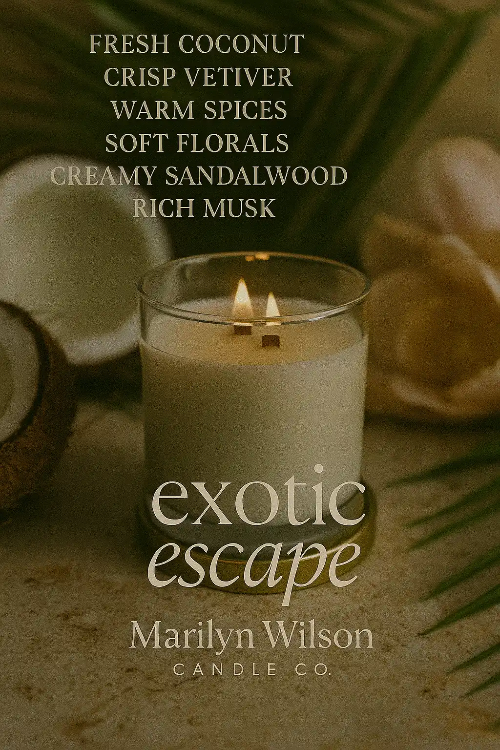 Exotic Escape is a journey for the senses. It opens with the smooth, sun-drenched aroma of fresh coconut, paired with the crisp lift of vetiver and a whisper of warm spice that lingers in the air like golden heat.