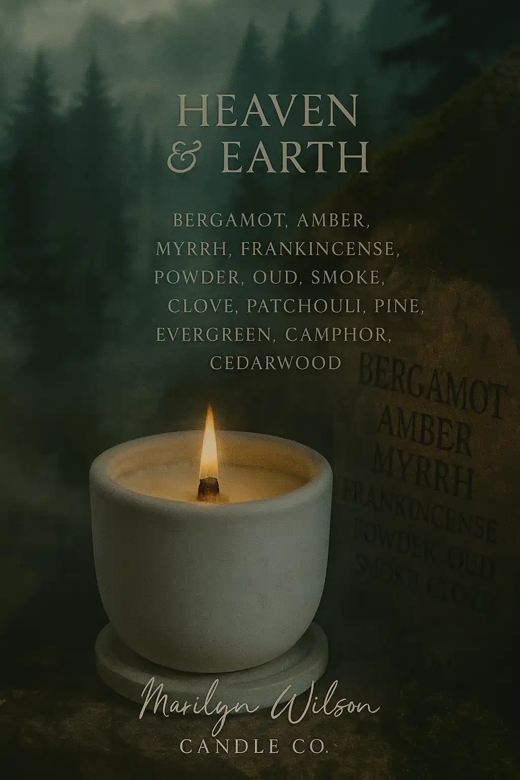 Heaven & Earth rises in layers, luminous bergamot and amber flicker first, before yielding to the ancient hush of myrrh, frankincense, and soft powder. Beneath it all, oud and smoke curl through clove and patchouli, grounded by pine, evergreen, camphor, and cedarwood.