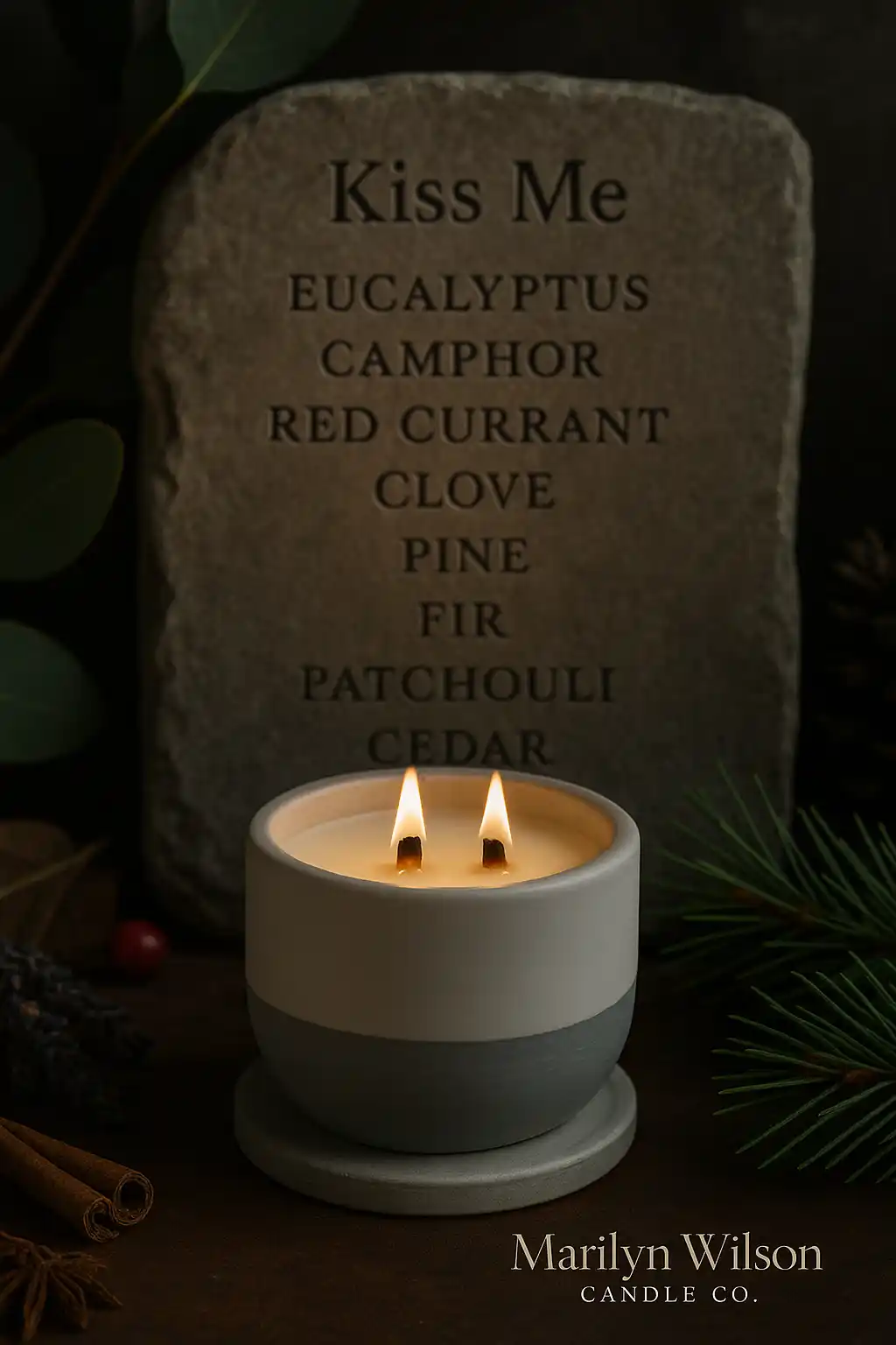 Kiss Me captures the cozy anticipation of a winter night, crisp air, soft lights, and the promise of something magical. Bright eucalyptus and red currant awaken the senses, while fir and pine whisper of snow-dusted branches. Clove warms the heart, and patchouli and cedar wrap everything in a woodsy embrace. It’s mistletoe, fireplace, and that one kiss you won’t forget.