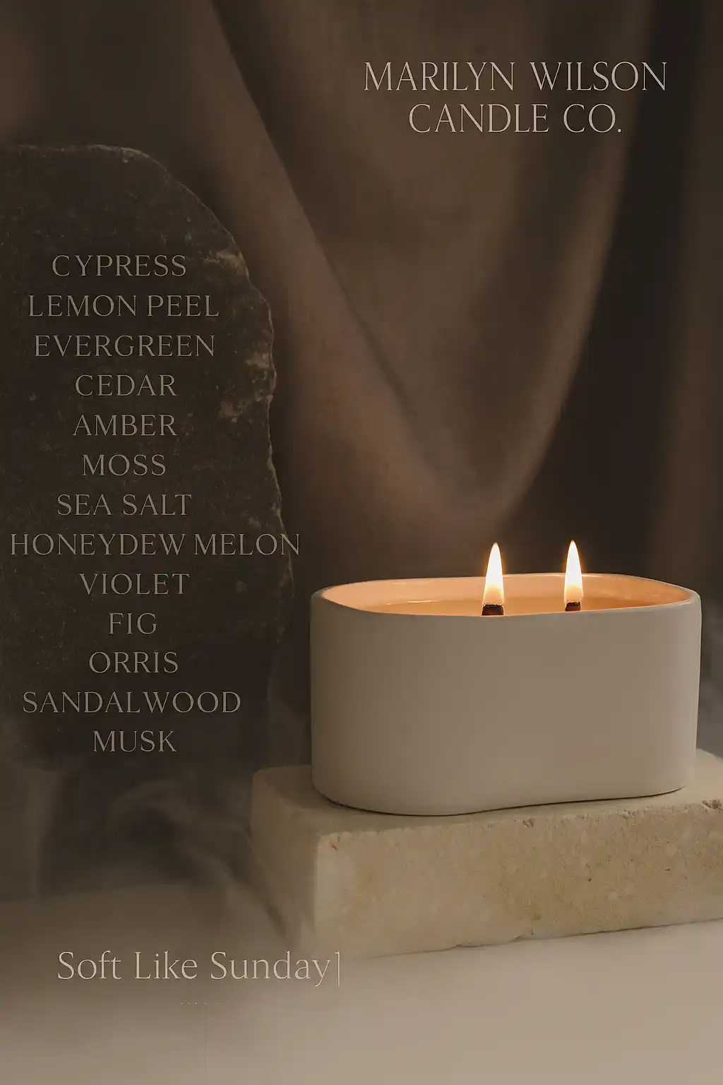 Soft Like Sunday is a gentle exhale in scent form, cypress and lemon peel open crisp and clean, balanced by airy evergreen and smooth cedar. Hints of honeydew, violet, and sea salt drift in like fresh sheets and open windows. And as it settles, amber, moss, fig, orris, sandalwood, and musk fold in like the last stretch of sunlight before evening.