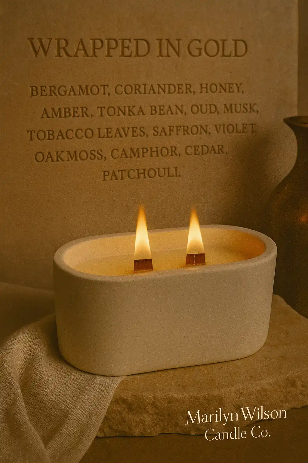 Wrapped in Gold is elegance set aflame, where spice, smoke, and sweetness melt into something unforgettable. Bergamot and coriander open with a golden spark, softened by honey and violet. Then it deepens, saffron, oud, and tonka bean curl into musk and tobacco leaf, grounded by rich oakmoss, patchouli, and cedar.